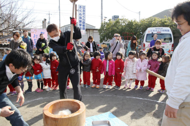 日本の伝統文化「お餅つき会」を行いました。お餅の搗き手としてのお父様方や食べやすいお持ちの大きさにして黄な粉をかけたり、磯辺巻きにしていただくお母様方等のスペシャルボランティア委員の皆様のおかげで、搗きたて…