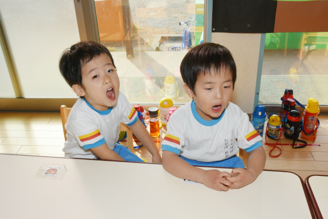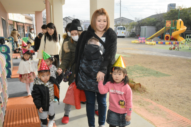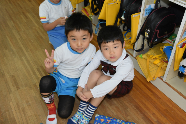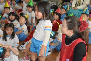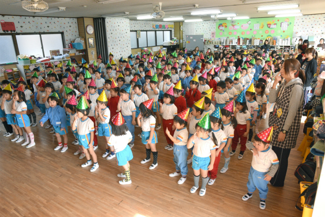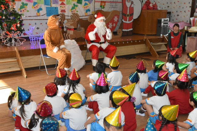 2学期最後で最大のお楽しみ「クリスマス会」を行いました。プレゼントを持ったサンタさんの登場から、子ども達は、目の色が変わり、さらにサンタさんの身振り、手振り、声の抑揚等表現力豊かなサンタさんに釘付け?子ども達からの英語の質問に 大きな声で丁寧に答えてくれたサンタさんと通訳のトナカイさん・・・毎年子ども達を楽しませてくれてありがとうございます。※お礼に子ども達からサンタさんに学年毎に歌のプレゼントをさせてもらったところ、ベリーベリーグッドとサンタさんにとても喜んでもらいました。夢のような世界、ひと時を過ごせたお友達は、本当に幸せだった・・・ことでしょう。新入園児のお友達、お母様方、如何だったでしょうか。
