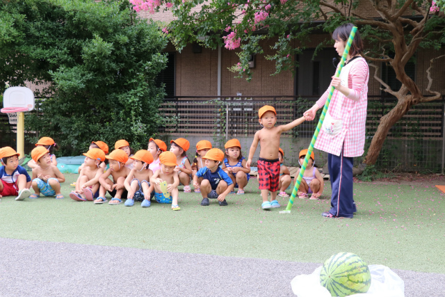 夏の暑い盛り、夏の定番でもある「すいか割り」を行いました。目隠しハチマキで、さあ~見事あたるかなぁ~割れるかなぁ~、、、次に、すいかが食べられる 大きな楽しみがありました。みんな パクリパクリ...あっという間にすいかが…