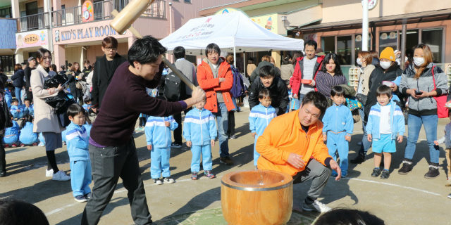 恒例のお餅つき会を行いました。当日は、風一つない暖かな絶好の行事日和の中、スペシャルボランティア委員のお父様やお母様方のご協力により餅つき体験や出来立てのお餅の試食会等を行う事が出来ました。お餅つき、、、日本古来の伝統行事、、、「どうやってお米がお餅になっていくんだろう?」~10時間以上水に浸し、その後、釜で蒸された餅米を臼に置き、餅米を搗ち手二人で十分搗けるようになるまでこね、次に交代で捏ねられた餅米めがけ、杵を頭上に振り上げ、搗きおろしていく、、、すると、真っ白、つるつる、ほかほか、美味しい美味しいお餅の出来上がり~出来上がったお餅をきな粉や海苔巻き(磯辺巻)に。お父様お母様方、お忙しい中、朝早くご来園、お手伝いいただいたお蔭で怪我もなく無事終えることが出来ました。本当にありがとうございました。厚く御礼感謝申し上げます。来年度も日本の伝統文化の継承、子ども達のためにご協力をどうぞよろしくお願い致します。