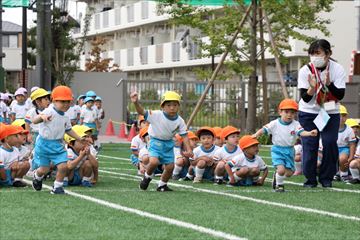 〇 運動会、入場も初めてだった年少組のお友達から、鮮やかな緑色と白線ラインが引かれた人工芝の大きな校庭に入場し、年中組、年長組のお友達みんなで、当園で日課のラジオ体操を行いました。コロナ禍で身体を動かす機会が制約される中…