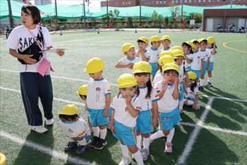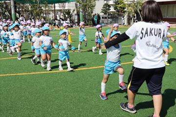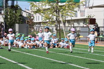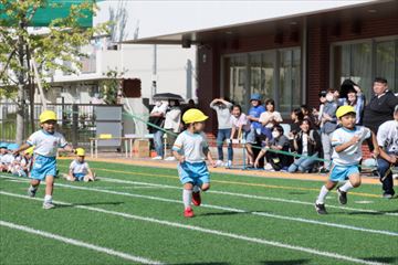〇 4月に入園し運動会「小学校の広々とした人工芝のグランドで(かけっこやゆうぎ、リレー)」を行うのが初めてだった年少組のお友達でしたが、担任の先生の指導のもと、かけっこでスタートのタイミングや行進、また、おゆうぎは、笑顔…