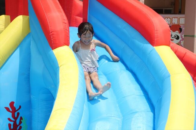 ~豪快にすべりスリルを楽しむ~ 年長組のお友達は、幼稚園最後のウォータースライダーでしたね。卒園後も夏の時期に「あっ、幼稚園の時、ウォータースライダーで遊んだっけ!たのしかったなぁ」と思い出になっていたら、嬉しい限りです…