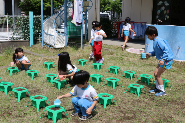 Details今年は、例年より梅雨明けが遅く、雨が降る日が多くなった、、、合間に、やっと「スイカ割り」を行う事が出来ました。子ども達の楽しみ、その1は、、、目隠しをしながらスイカをわることが出来るか?目隠しをしている棒を持っているお友…